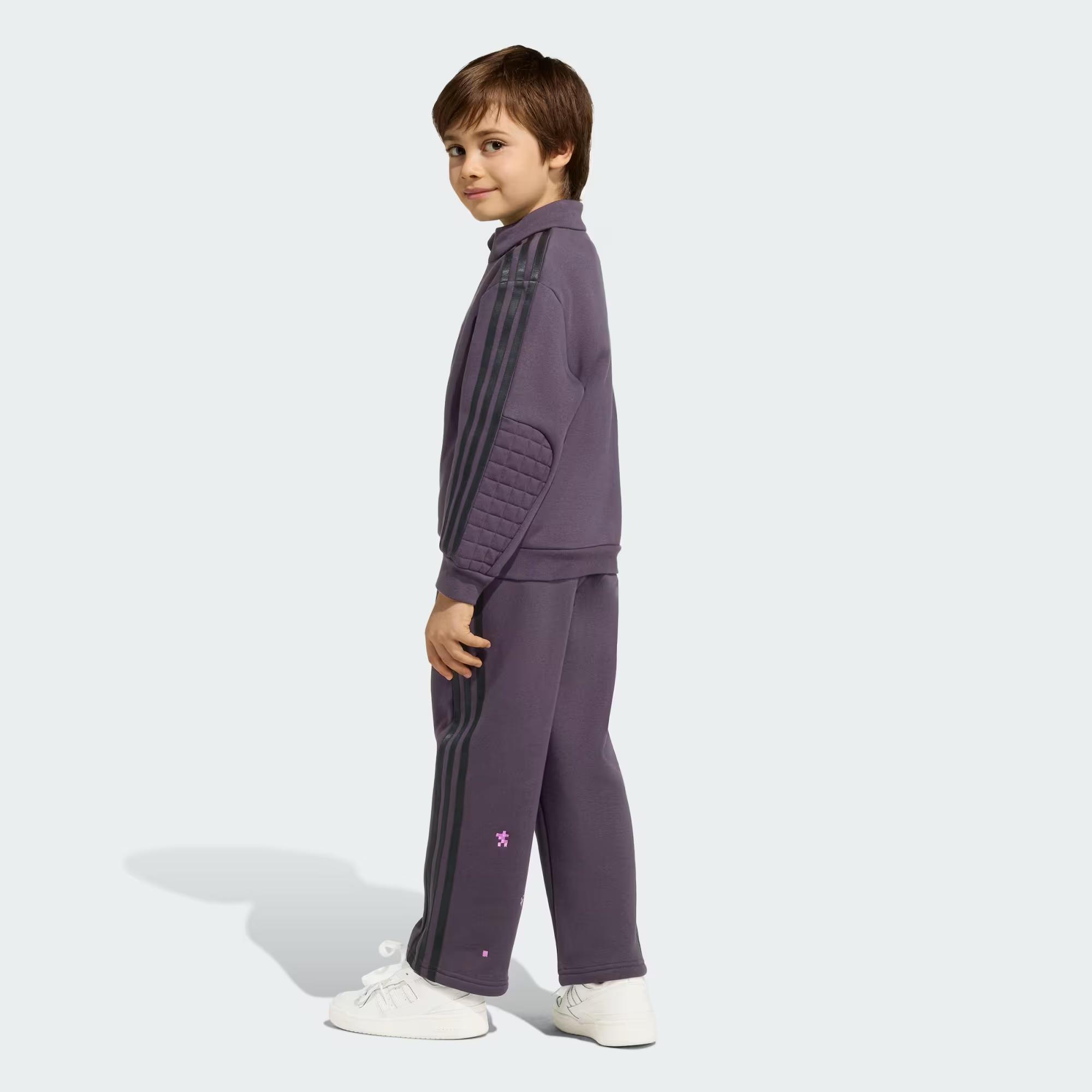 Bol kesim Eşofman altı: bağcık; üst: bisiklet yaka Havlu kumaş: %70 pamuklu, %30 polyester (%100 geri dönüştürülmüş) Minecraft grafikleri adidas Trefoil