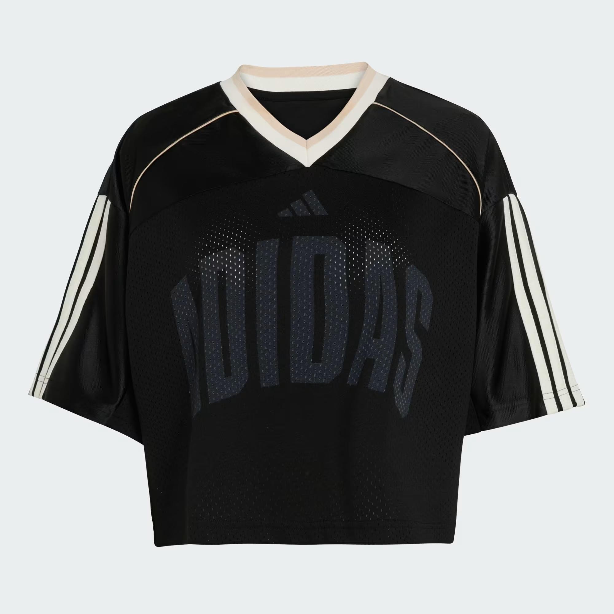 Bol kesim V yaka %100 polyester (%100 geri dönüştürülmüş) File yapı Hafif kısa boy Saten fitil Omuzda triko panel Göğsün ön kısmında adidas Sportswear baskısı