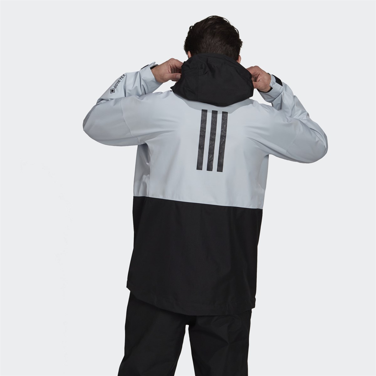 Yüksek yakalı tam fermuar GORE-TEX Paclite %100 geri dönüştürülmüş polyester düz dokuma Nefes alabilir, dayanıklı ve su geçirmez Yan fermuarlı cepler Vizörlü ayarlanabilir kapüşon Adjustable hem Cırt cırtlı ayarlanabilir manşetler düz örgü