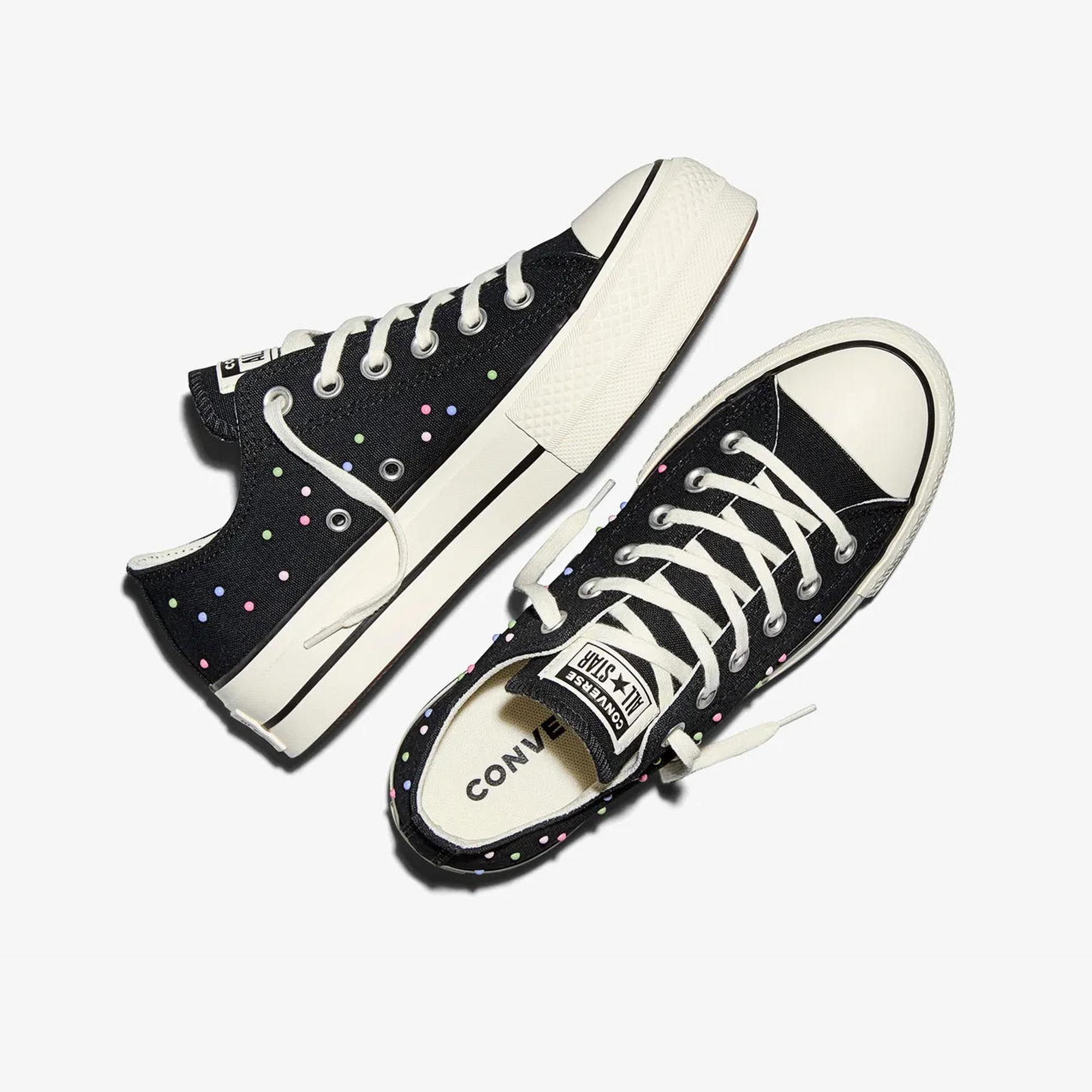 Klasik Chuck tarzını yansıtan dayanıklı kanvas üst yüzey Üstün konfor sağlayan OrthoLite yastıklama Baskı yıldız detayları tarzını yansıtır İkonik Chuck Taylor bilek etiketi ve All Star plaka detayı Topuk yüksekliği: 4 cm %100 PAMUK