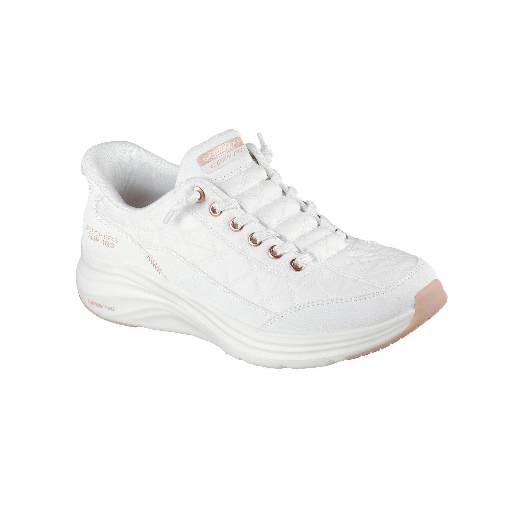 Skechers Air-Cooled Memory Foam® iç taban, ayağın şeklini alarak kişiye özel uyum sunar. Nefes alabilen yapısı, ayakların serin ve kuru kalmasını sağlar. Yumuşak yastıklama etkisiyle uzun süreli kullanımlarda dahi rahat adımlar atmanıza yardımcı olur. Contour Foam™ Orta Taban ve Cozy Fit™ Üst Yüzey Contour Foam™ orta taban, ayağın doğal formuna uyum sağlayarak her adımı yumuşatır. Hafif yapısı, yorgunluğu azaltarak hareket özgürlüğü kazandırır. Cozy Fit™ kapitone malzeme, ayağı sıcak ve rahat bir şekilde sarar. Pratik ve Güvenli Kullanım No Tie Fit™ sabit esnek bağcıklar, asla çözülmez ve her zaman hazır bir kullanım sunar. Dayanıklı duraleather kaplama, uzun ömürlü kullanım sağlar. Esnek dış taban, farklı zeminlerde güvenli tutuş sunar. Makinede yıkanabilir yapısı ile kolay bakım imkânı verir. Skechers Hands Free Slip-ins®: Contour Foam™ – Cozy Fit™ Golden Hour kadın spor ayakkabı, zahmetsiz giyim kolaylığını, gelişmiş konfor teknolojilerini ve lüks yumuşaklığı bir arada sunarak günün her anında eşsiz bir deneyim yaşatır.