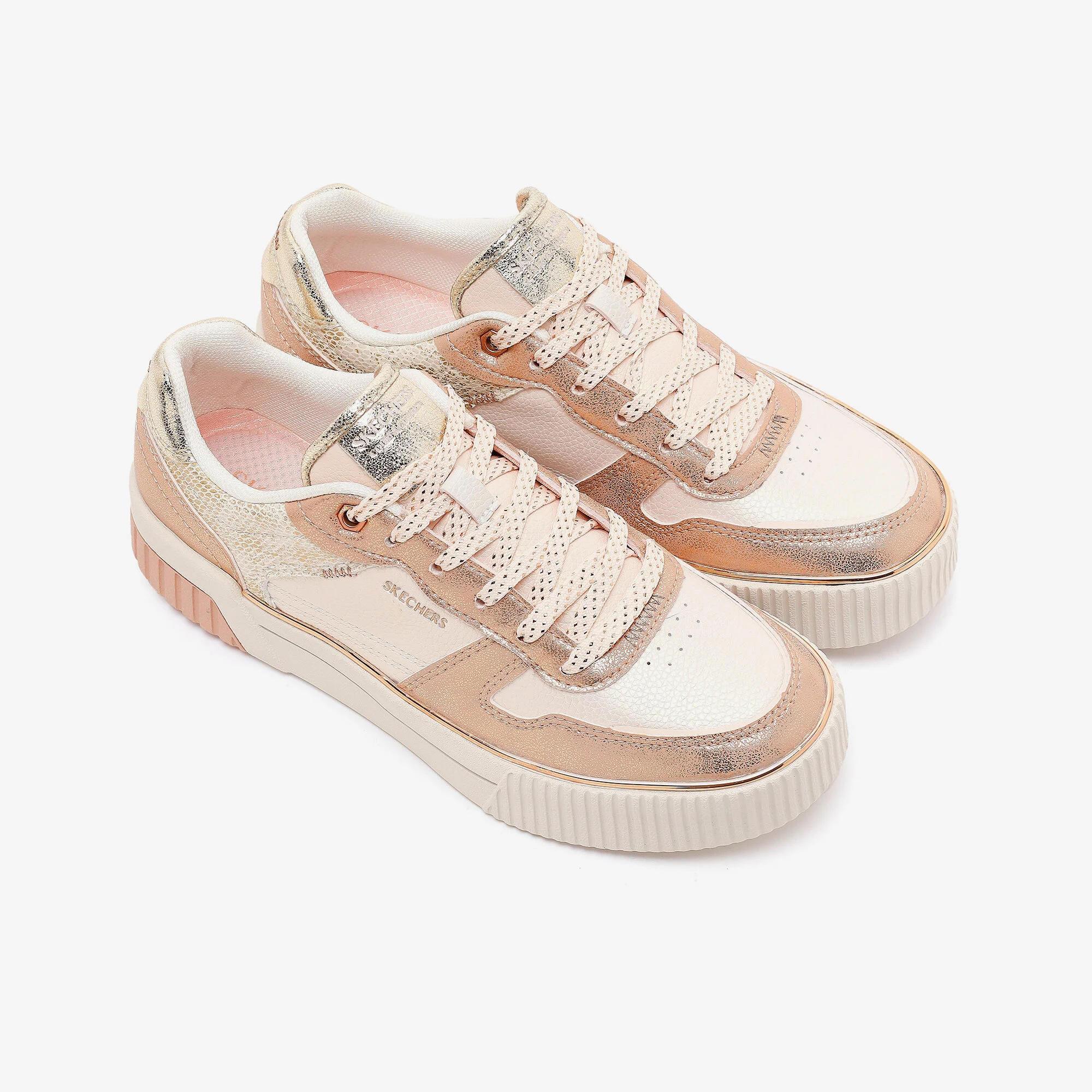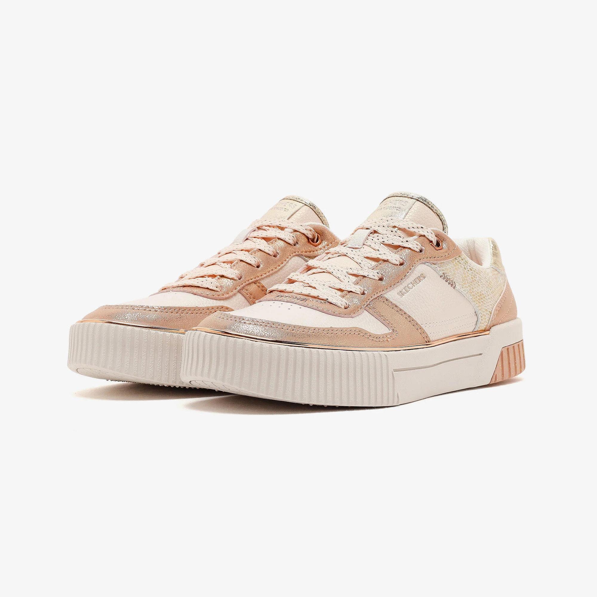 Skechers Air-Cooled Memory Foam® iç taban ile yumuşak ve ferah adımlar Bağcıklı ön tasarıma sahip court stil sneaker formu Işıltılı duraleather üst yüzey ve metalik kaplama detayları Hafif ve dengeli kullanım sunan kalıplı taban yapısı Günlük kullanımda güven hissini destekleyen kauçuk dış taban Çamaşır makinesinde yıkanabilir Yaklaşık 3,6 cm topuk yüksekliği